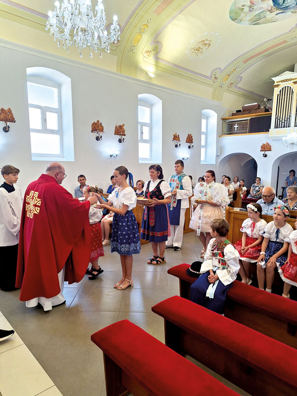 PD Popudinské Močidľany už tradične začali oslavu ďakovnou omšou v Kostole sv. Šimona a Júdu, kde pán farár požehnal úrodu ktorú mu v košíkoch priniesli krojované deti z obce. Nechýbl samozrejme aj symbol dožiniek - dožinkový veniec.